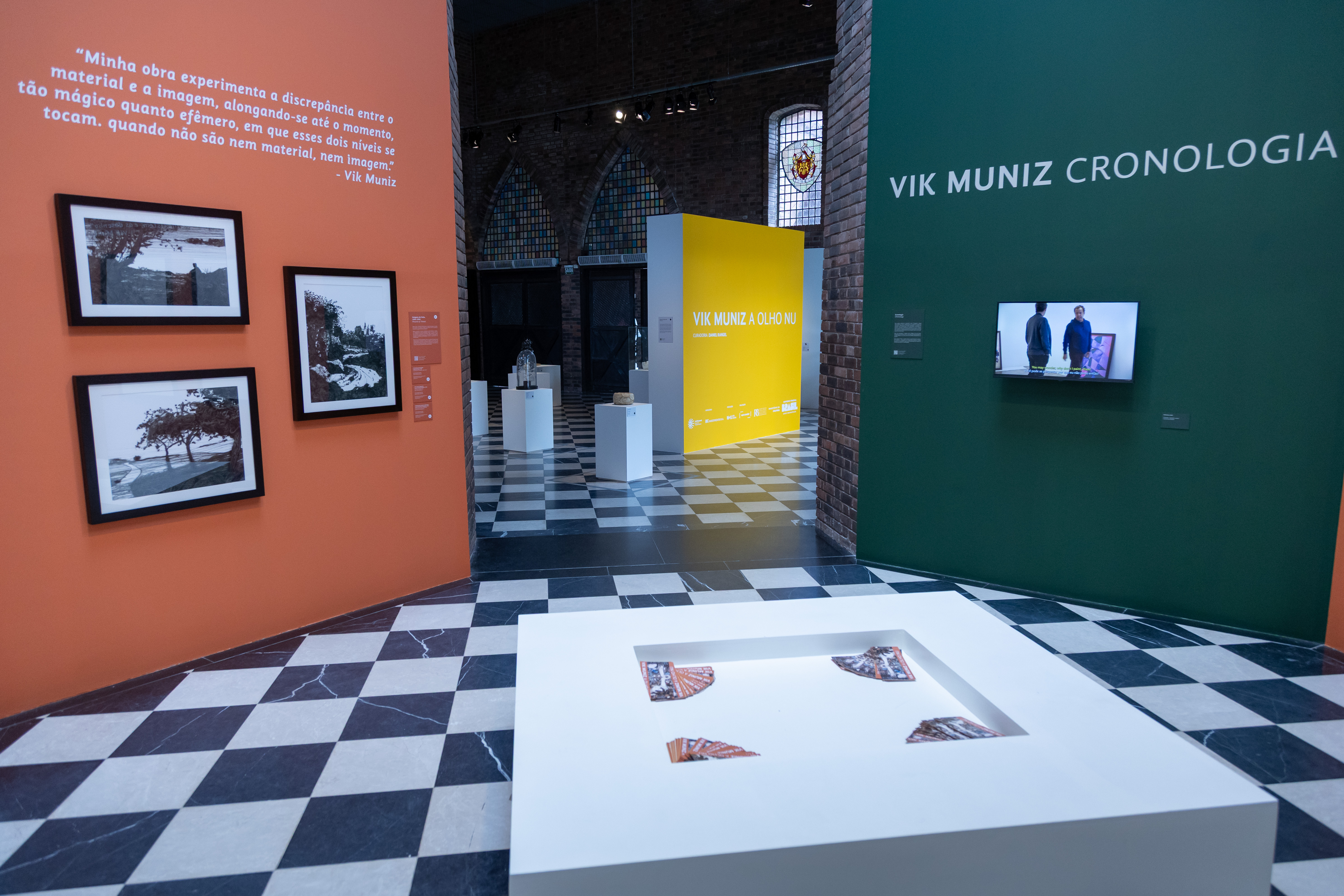 A olho nu exibe toda a diversidade de materiais usados por Vik Muniz na produção de suas imagens fotográficas – açucar, diamantes, lixo, sucata, feijão, terra, entre outros. O curador buscou também destacar a aproximação entre o universo popular de Vik e o existente na cultura nordestina, “seja pela utilização de elementos do cotidiano, pela forma como os organiza ou pelas imagens que produz”.