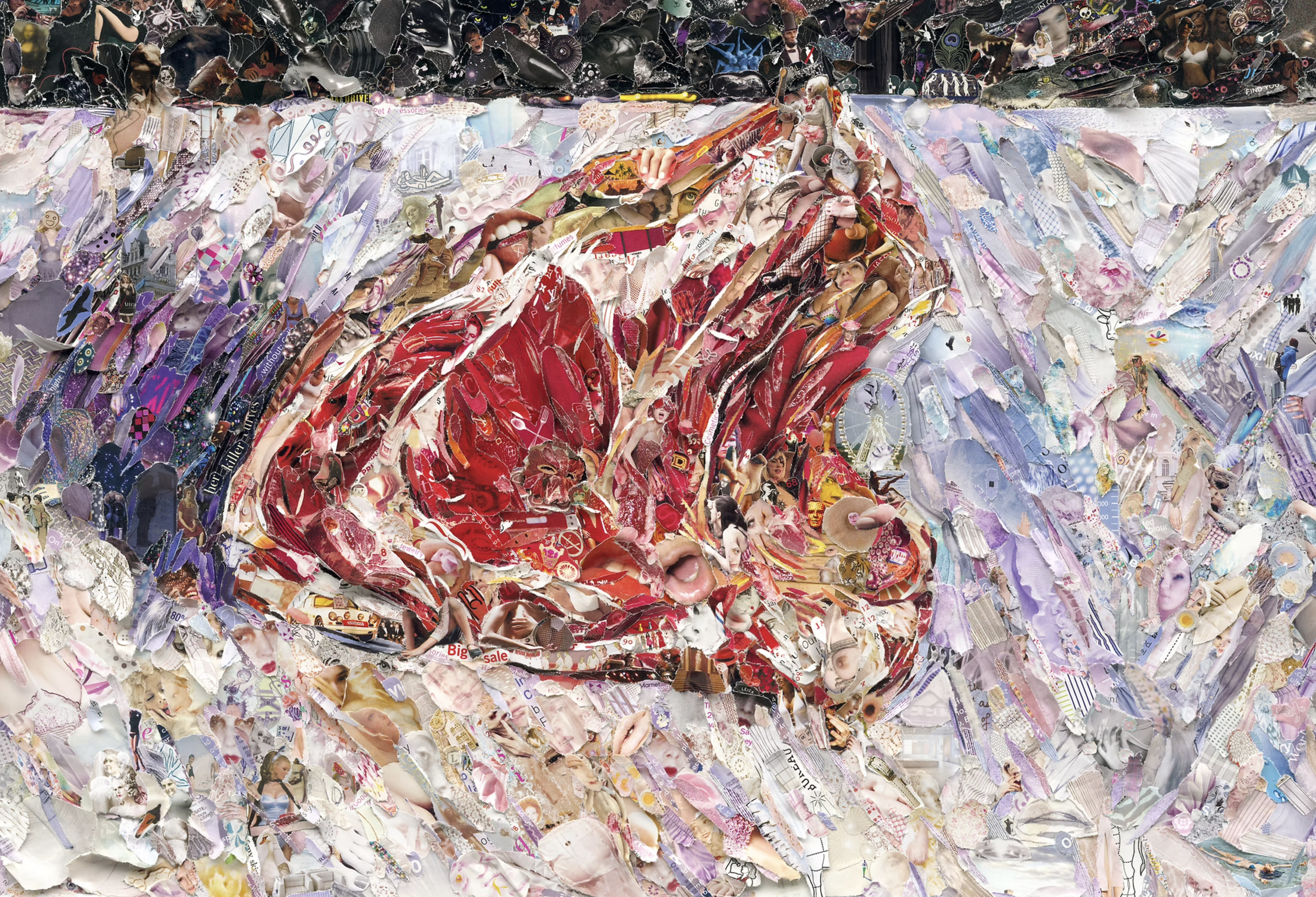 Vik Muniz, the artist’s first solo exhibition at Matthew Liu Fine Arts, features 14 works from several important series throughout his oeuvre. In Pictures of Magazines series II (2011-2013), Muniz employs torn paper pieces from popular magazines to recreate the iconic images of tourist sites and paintings. The intersection and rich layering of text and image render the masterpieces by Pierre-Auguste Renoir, Claude Monet and Gustave Caillebotte delightfully kaleidoscopic, providing the viewers continuous visual pleasure. Postcards from Nowhere series (2014) addresses to the materiality of photography, reclaiming the values that has been increasingly leached away in our inexorable march for advanced technology. In creating The Picture of Pigment series (2005-2011), Munize sprinkled colored powder pigment over reproductions of several minimalist works and photographed them from above. Created in 2011, Crane demonstrates the artist’s belief that art can facilitate transformations in the society. Worked in collaboration with school children in the New York City, this work aimed to benefit the victims of 2011 tsunami in Japan.